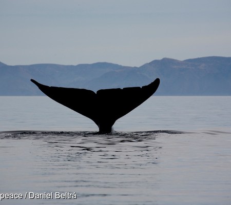Greenpeace denuncia que agua de buques salmoneros cargadas de marea roja están siendo vertidas en hábitat clave de las ballenas azules.